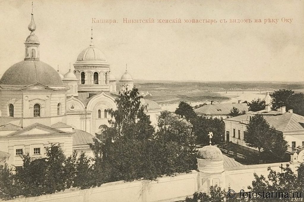Перед вами — старинная фотография Никитского женского монастыря в Кашире с живописным видом на реку Оку. Этот архитектурный ансамбль в начале ХХ века был не только духовным центром, но и важным социальным учреждением.