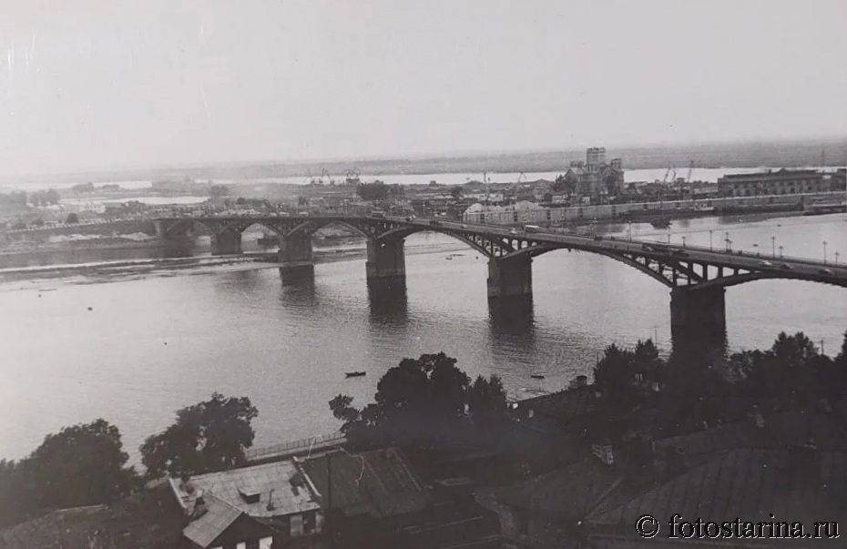 Перед нами — старинная фотография, запечатлевшая один из знаковых видов Горького: Канавинский мост, пересекающий реку Оку, и величественный храм Александра Невского на Стрелке. Этот снимок позволяет окунуться в атмосферу города середины XX века, когда индустриальный ритм сосуществовал с архитектурными памятниками дореволюционной эпохи.