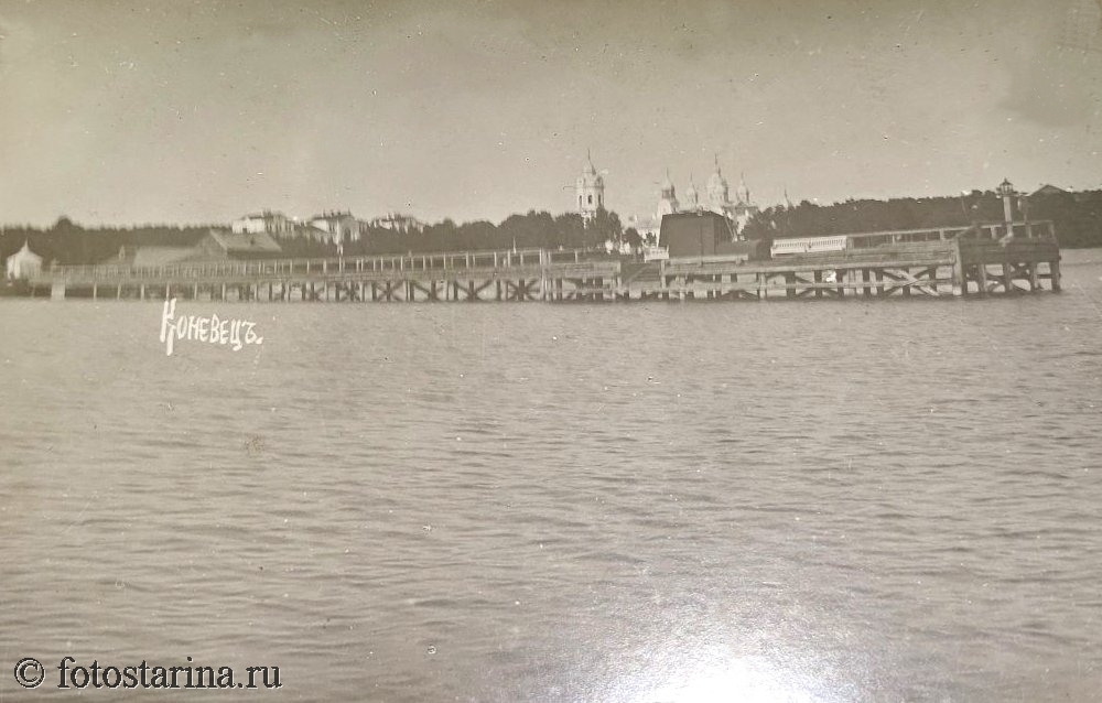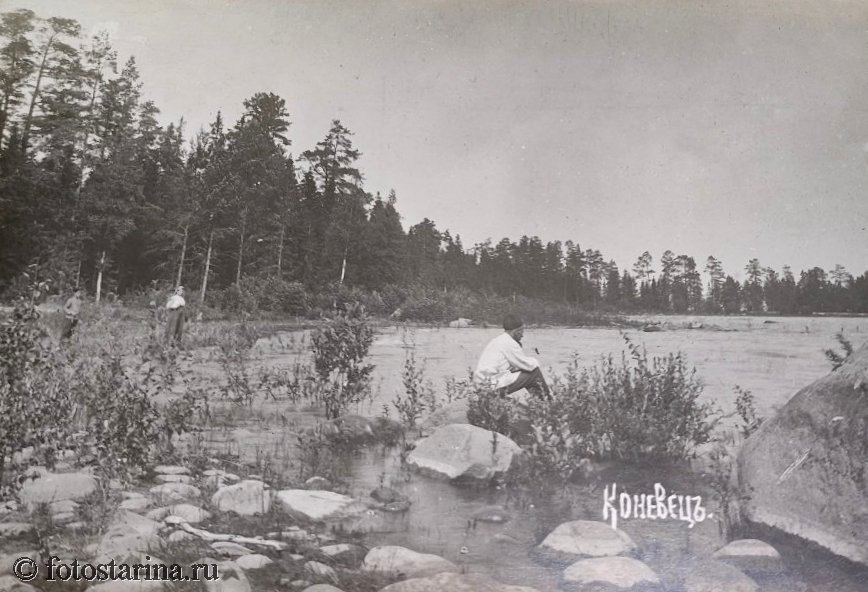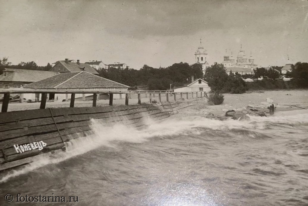 На старинной фотографии запечатлён остров Коневец — уединённый уголок духовной жизни на Ладожском озере. В дореволюционные годы здесь располагался Коневский Рождество-Богородицкий мужской монастырь, чья повседневная жизнь была наполнена трудом и молитвой.