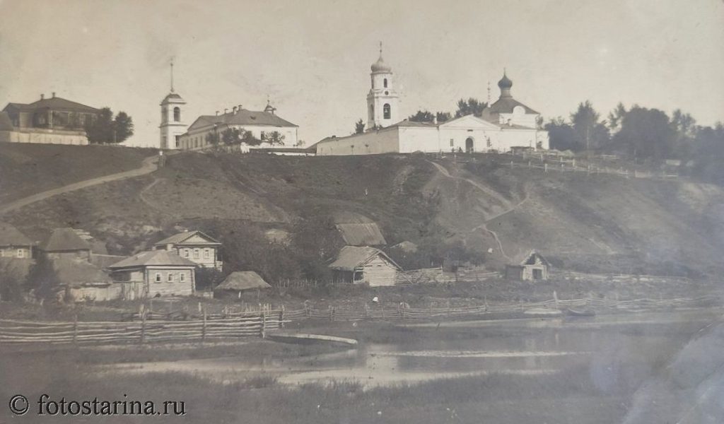 Монастырь гармонично вписывался в сельский пейзаж: деревянные дома, заборы, река на переднем плане подчёркивают его уединённость.