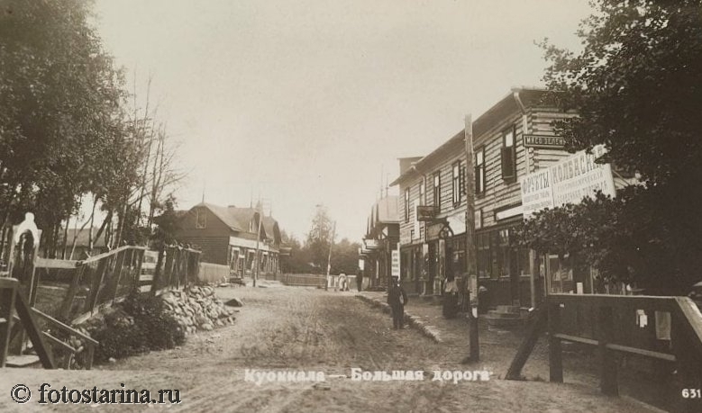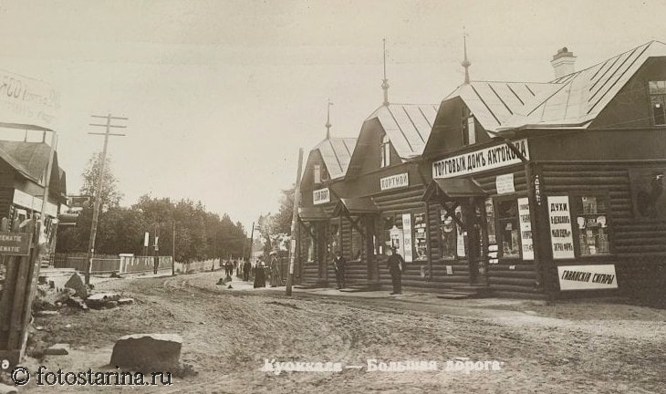На старинной фотографии запечатлена Большая дорога в Куоккале (ныне Репино) — главная артерия популярного дачного посёлка, куда устремлялись петербуржцы в поисках отдыха у моря. Эта улица (ныне — участок Приморского шоссе) была сердцем курортной жизни: здесь стояли самые роскошные дачи, магазины и общественные здания.