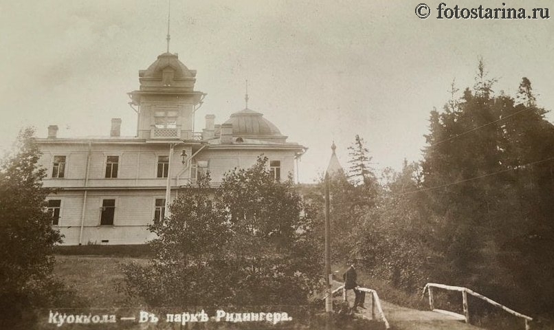 Перед вами — завораживающий снимок из прошлого: Куоккала (ныне Репино), парк Ридингера, начало XX века. Деревянное здание с башней и куполом, утопающее в зелени, словно переносит нас в эпоху дачной идиллии на берегу Финского залива. Давайте разберёмся, какую историю хранит этот кадр!