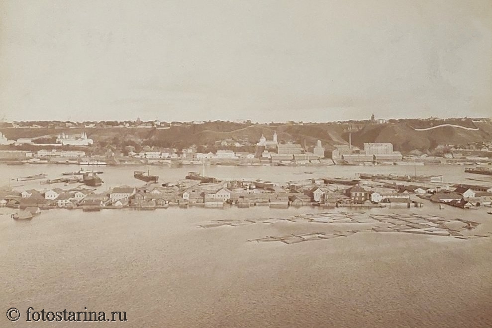 Перед нами — старинная фотография Нижнего Новгорода, запечатлевшая городской пейзаж с рекой во время половодья. Этот снимок — свидетельство того, насколько серьёзно весенние разливы влияли на жизнь города.