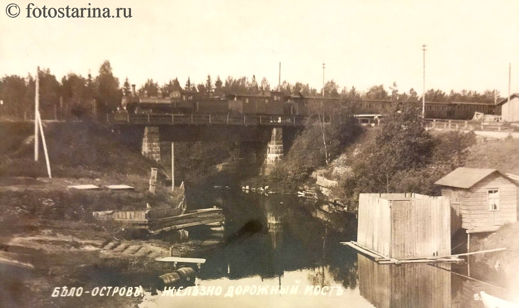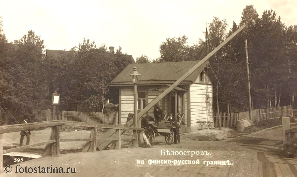 На старинной фотографии запечатлён Белоостров — пограничный пункт на финско-русской границе в начале ХХ века. Перед нами — небольшой деревянный домик сторожа, шлагбаум, перекрывающий дорогу, и конная повозка. Эта сцена ярко иллюстрирует повседневную жизнь пограничной зоны того времени.