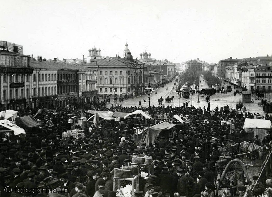На старинной фотографии запечатлена оживлённая атмосфера Трубной площади — одного из самых колоритных мест Москвы начала XX века. В центре внимания — Птичий рынок, перенесённый сюда из Охотного ряда в 1840-х годах.