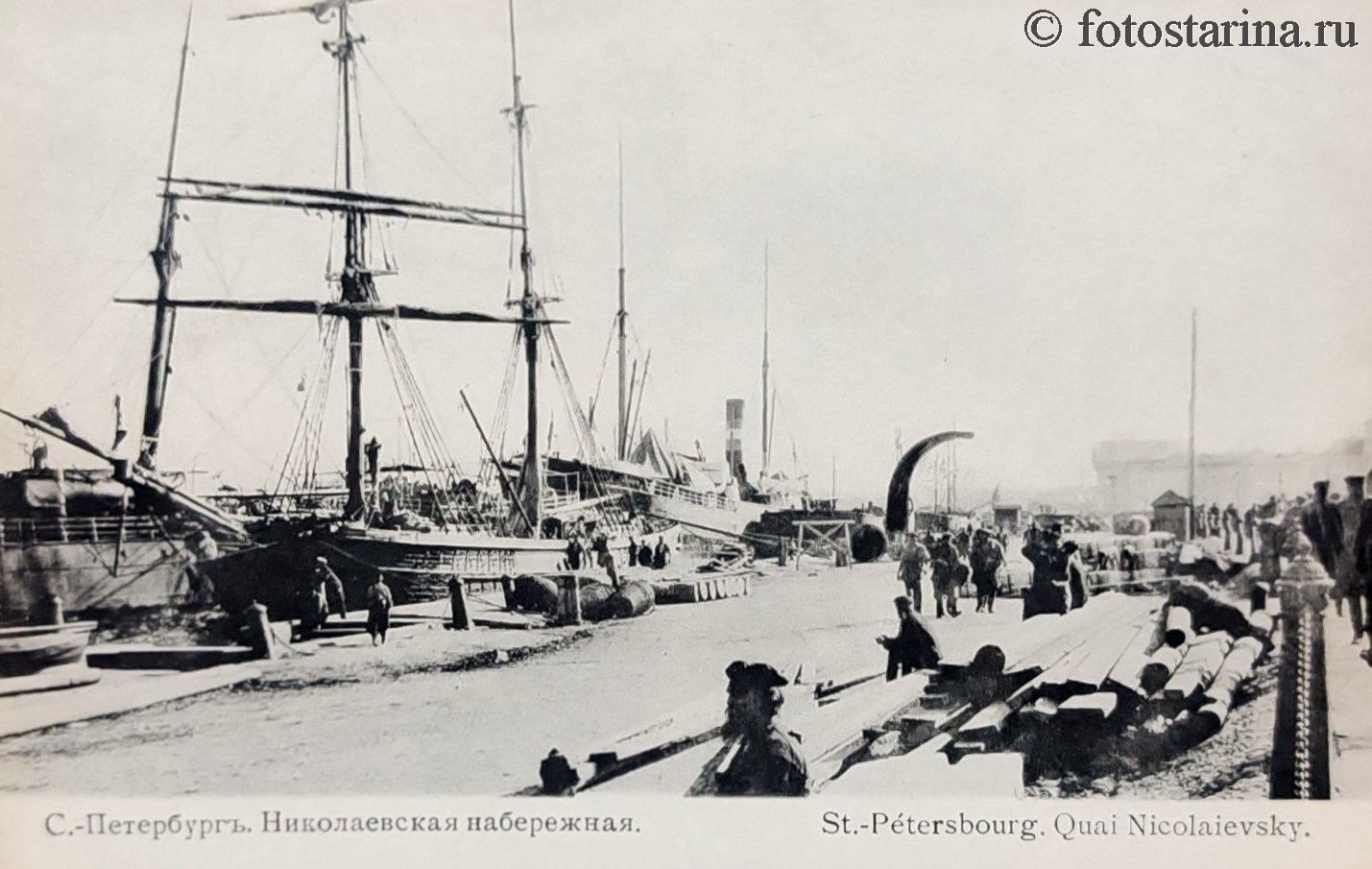 На старинной фотографии запечатлена не просто улица, а живой организм города: шумная пристань, грузовые операции, движение экипажей. Это окно в прошлое, позволяющее увидеть, как функционировал Санкт-Петербург начала ХХ века.