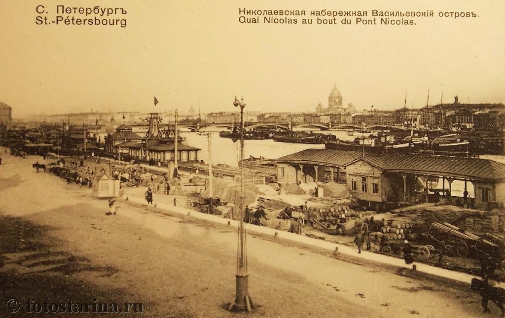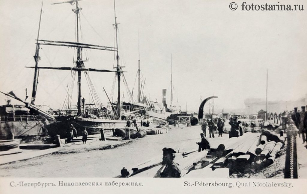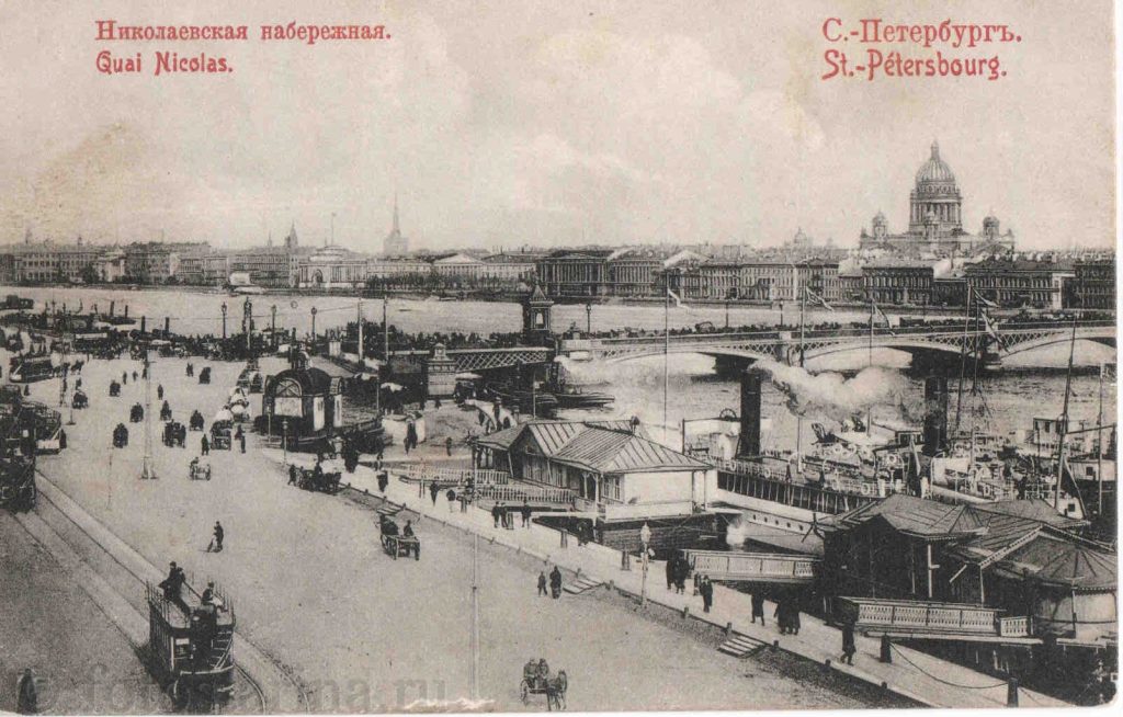 Перед вами — старинная фотография Николаевской набережной (ныне — набережная Лейтенанта Шмидта), запечатлевшая оживлённую жизнь Санкт-Петербурга начала ХХ века. Этот участок города, расположенный на Васильевском острове вдоль Большой Невы, был не просто живописной прогулочной зоной, а важнейшим транспортным и торговым узлом.